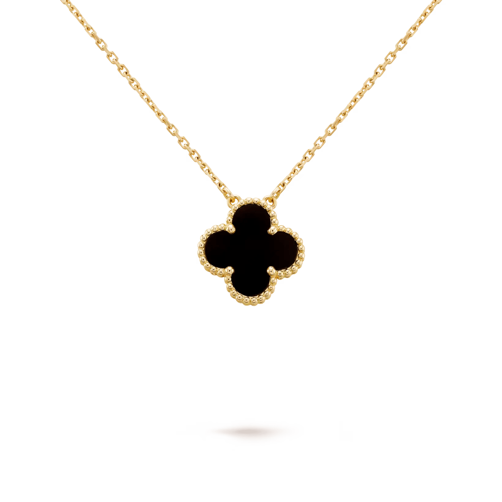 El diseño característico del collar Alhambra presenta un motivo de trébol de cuatro hojas hecho con materiales preciosos como Oro 18k o Plata con baño de oro PVD y Ónyx. Se dice que el trébol de cuatro hojas representa la suerte, la prosperidad y la armonía espiritual, mientras que la elección de materiales y gemas refleja la conexión con la naturaleza y la elegancia eterna.