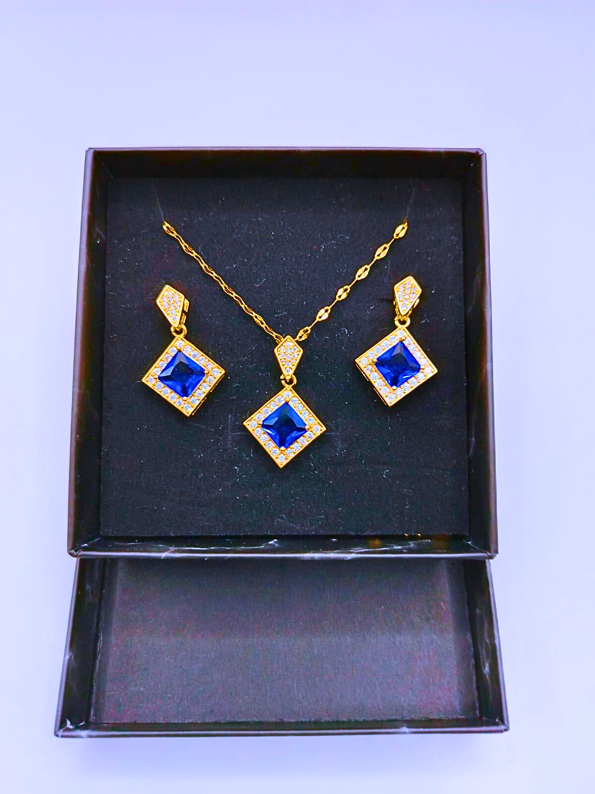 NEB0001 - Collar y Aretes Acero Titanio Rombo Circonita Cubica Azul Chapa Oro 14k Calenbi